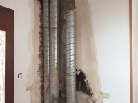 Treballs de guix i plaques de guix per refer la paret i el sostre després del desmantellament d'una xemenei.